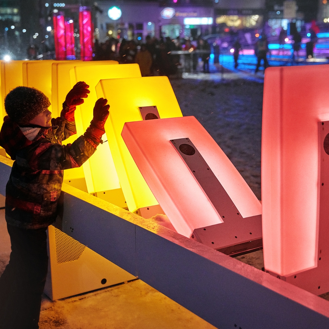 Le public est invité à s’amuser avec les dominos géants répartis en plusieurs stations pour créer des effets lumineux et musicaux.